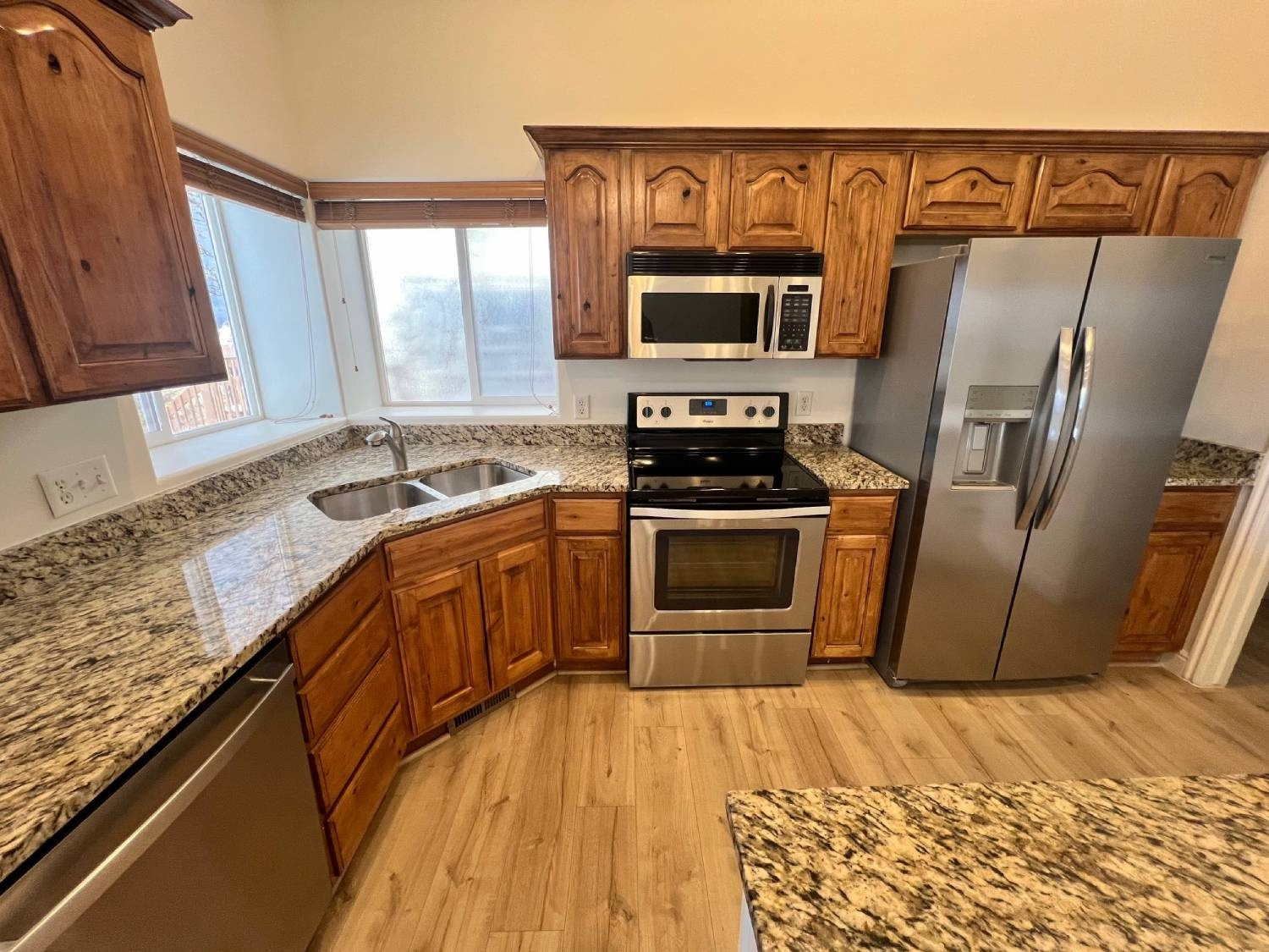 Step inside this impeccably refreshed residence—like-new from top to bottom with fresh paint throughout, brand-new flooring, gleaming stainless-steel appliances, updated systems, and a brand-new roof backed by a 25-year warranty. The main-floor living design keeps everything effortless and elegant: a spacious great room where living, dining, and kitchen flow seamlessly together, anchored by granite counters, knotty alder cabinets, and a massive walk-in pantry.